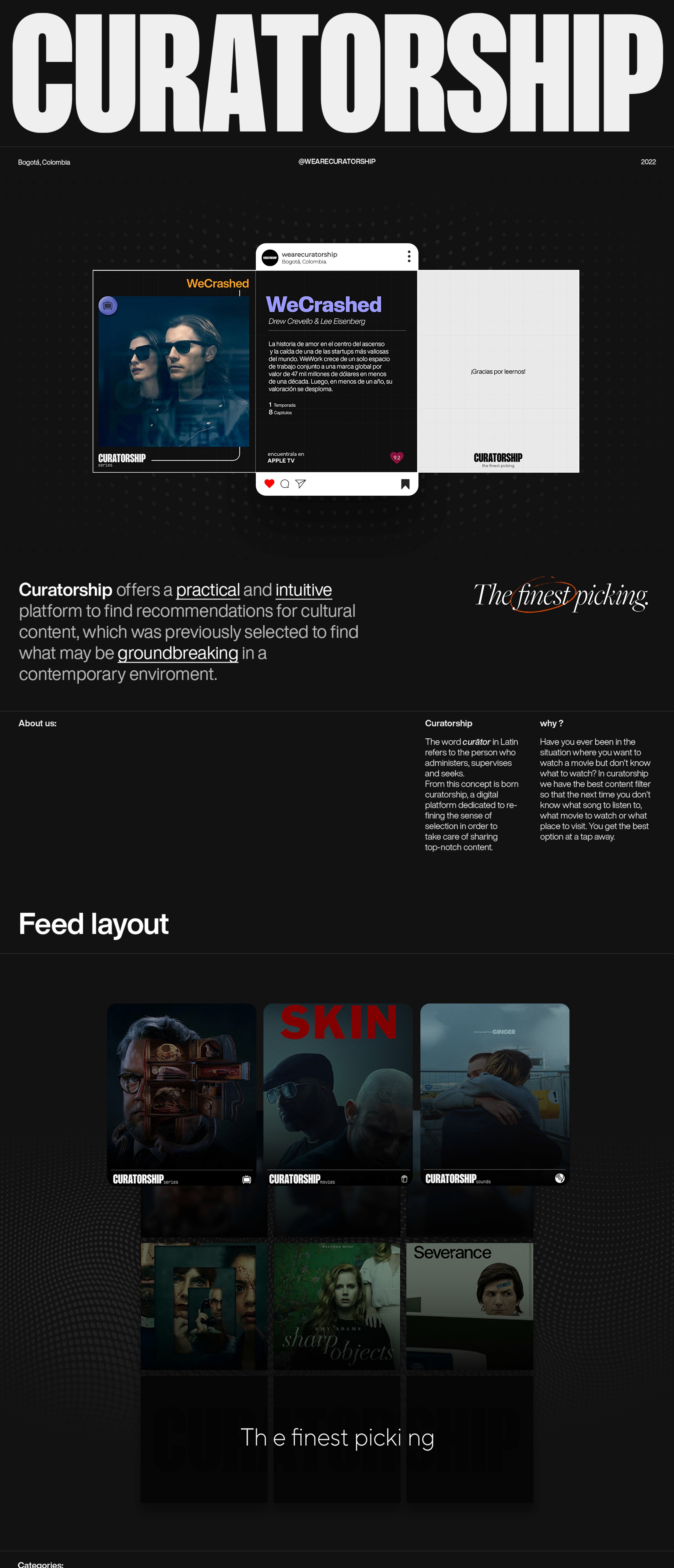 Curatorship is a visually sharp and conceptually intentional platform that offers a practical, intuitive system for discovering cultural content with meaning. From series and films to art, places, and events, it serves as a compass for those seeking carefully selected recommendations within a contemporary environment. Every piece featured is part of a refined selection process that values narrative depth, aesthetic resonance, and critical relevance — built on the belief that curation is, in itself, a creative act.